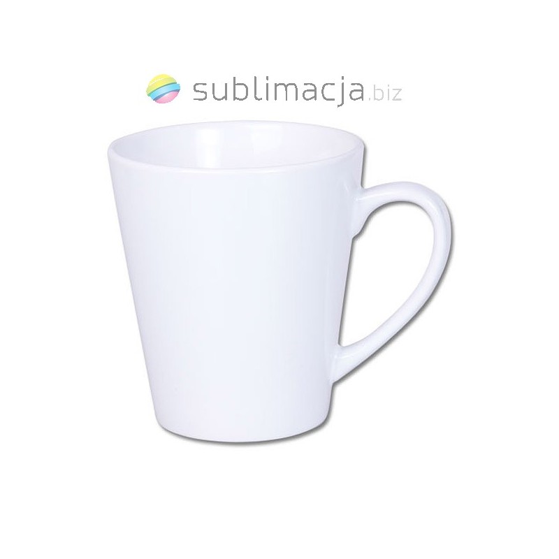 Kubek Latte mały. Idealnie biały, bardzo dobra jakość ceramiki z połyskiem, możliwość mycia w zmywarkach. Kubek przeznaczony do wykonywania nadruków metodą sublimacji, termotransferu lub w piecach.