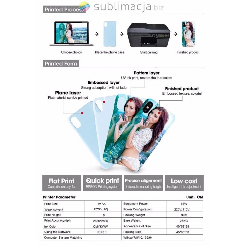 W skrócie: Za pomocą tej drukarki UV można drukować na większości materiałów: sztywnych, elastycznych, tworzywach sztucznych (ABS, PC, PE, PP, PU, PVC, itp.), akryl, metal, drewno, skóra, szkło, kryształ, papier, itp. Ddzięki zastosowaniu w drukarce lamp led wykonany wydruk nie wymaga utrwalania na dodatkowych urządzeniach oraz suszenia, ponadto wydruk jest odporny na warunki atmosferyczne w tym promieniowanie UV.