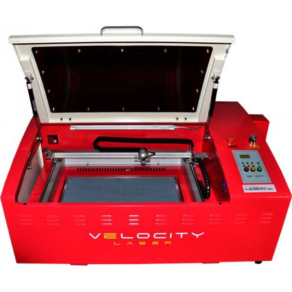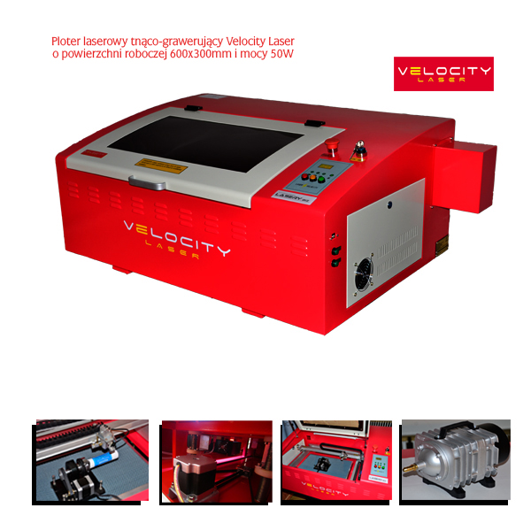 Ploter Velocity Laser jest nowoczesnym i profesjonalnym systemem laserowym z głowicą CO2 przeznaczonym do cięcia i grawerowania szerokiej gamy materiałów. System laserowy wyposażony w źródła laserowe CO2 został stworzony z myślą o jak najniższych kosztach zakupu maszyny dla Klienta przy zachowaniu wysokiej jakości charakteryzującej inne, droższe urządzenia. Urządzenie zostało zaprojektowane, aby zaspokoić wymagania stawiane przez branże zajmujące się obróbką tworzyw sztucznych, gumy, drewna, skóry, tkanin, kartonu itp. Wysoka jakość cięcia na dużej powierzchni stołu roboczego, precyzja i stabilność są jednymi z wielu zalet tego urządzenia. Velocity Laser to prosta, zamknięta konstrukcja w 4 klasie bezpieczeństwa, z bardzo precyzyjnym i szybkim układem ruchu zapewnionym przez wysokiej jakości silniki krokowe, z możliwością załadunku materiału z frontu. Stół roboczy dostępny w 3 rozmiarach od bardzo kompaktowego 300x200 mm do zadowalającego większość Klientów, do bardzo dużego formatu o rozmiarach 600x300mm.