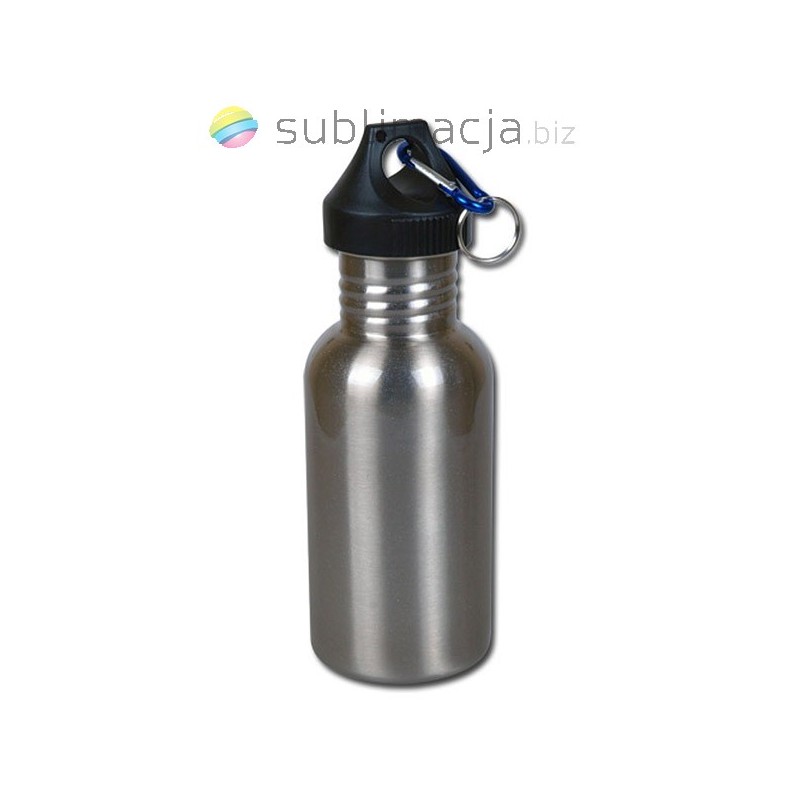 Sportowy bidon do napojów (srebrny). Pokryty jest specjalną powłoką, przeznaczoną do sublimacji.