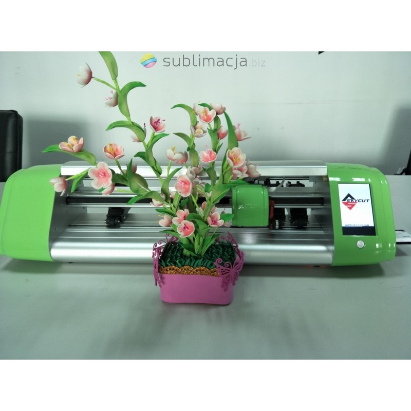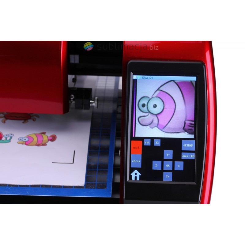 Ploter Krafrowy tnący SkyCUT 360mm. Kamera OPOS- rozpoznawanie znaczników, kolorowy panel dotykowy. Automatyczne cięcie konturowe wydruków, naklejek, nadruków na białym flexie na bawełnę.