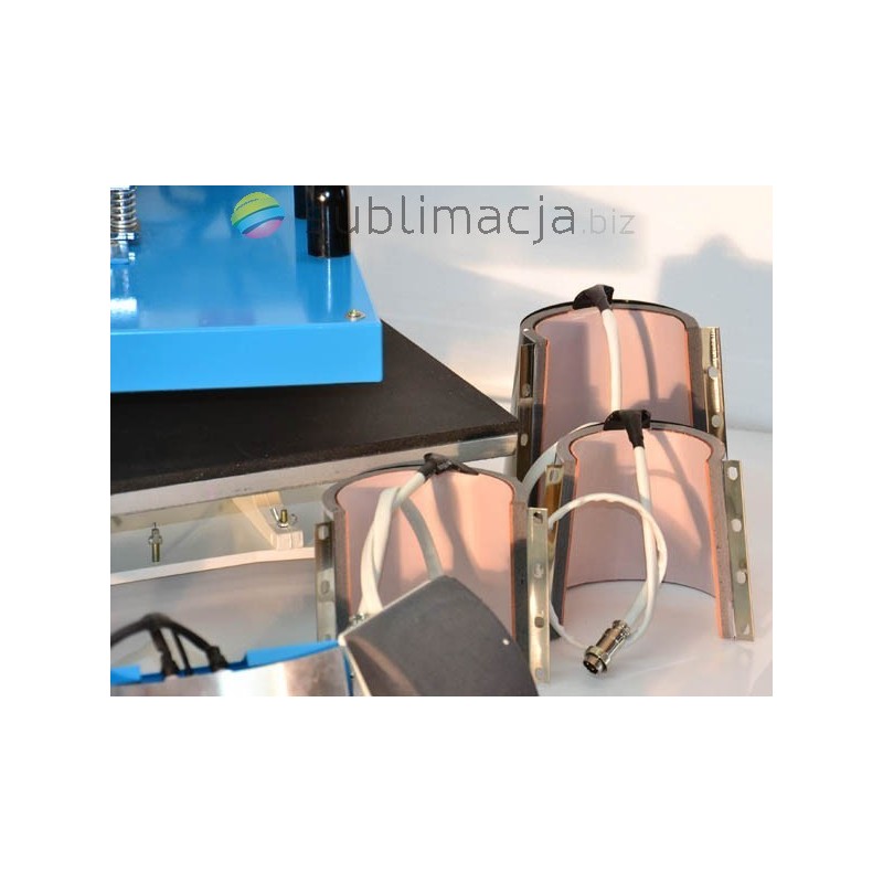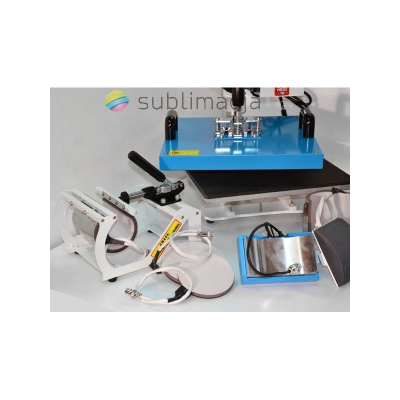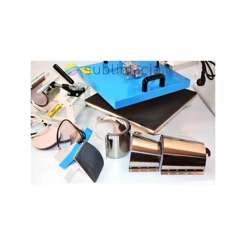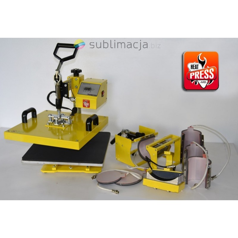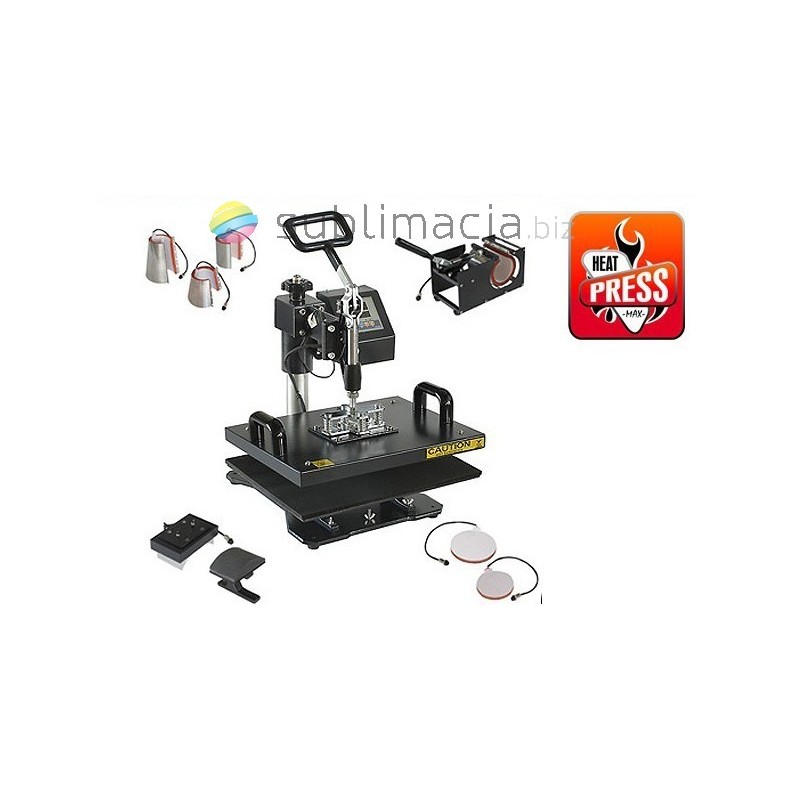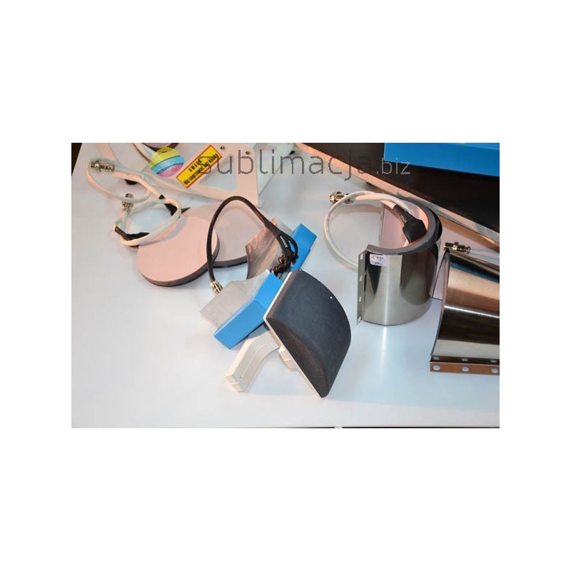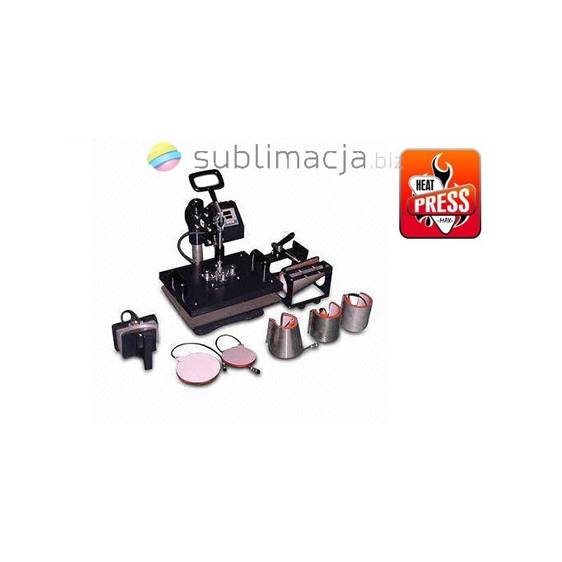 Prasa płaska o dużej powierzchni grzewczej 38x38cm. PRASA TERMO-TRANSFEROWA 8 w 1 COMBO. Do koszulek t-shirt, do czapek, do kubków walcowych i stożkowych "latte"- hot mug, dwa zestawy do talerzy dużych i mniejszych. Łatwa wymiana końcówek dzięki zastosowaniu magnetycznych uchwytów, sterowanie elektroniczne, regulowany płynnie docisk.