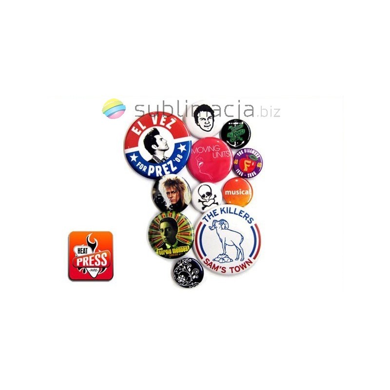 NOWOŚĆ Zestaw zawiera również praskę do butonów - przypinek w skład której praska, zaciskarka, oraz wykrawak. Dodatkowo do tego zestawu dla każdego klienta 100 przypinek GRATIS (Dostępne w rozmiarze 32/58mm). Przypinki wykonane są z blachy chromowej na wierzchu posiadają foliowany obrazek odporny na warunki atmosferyczne.