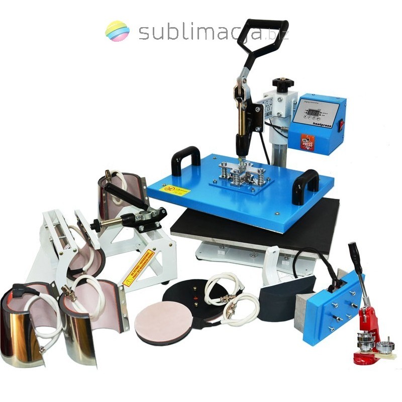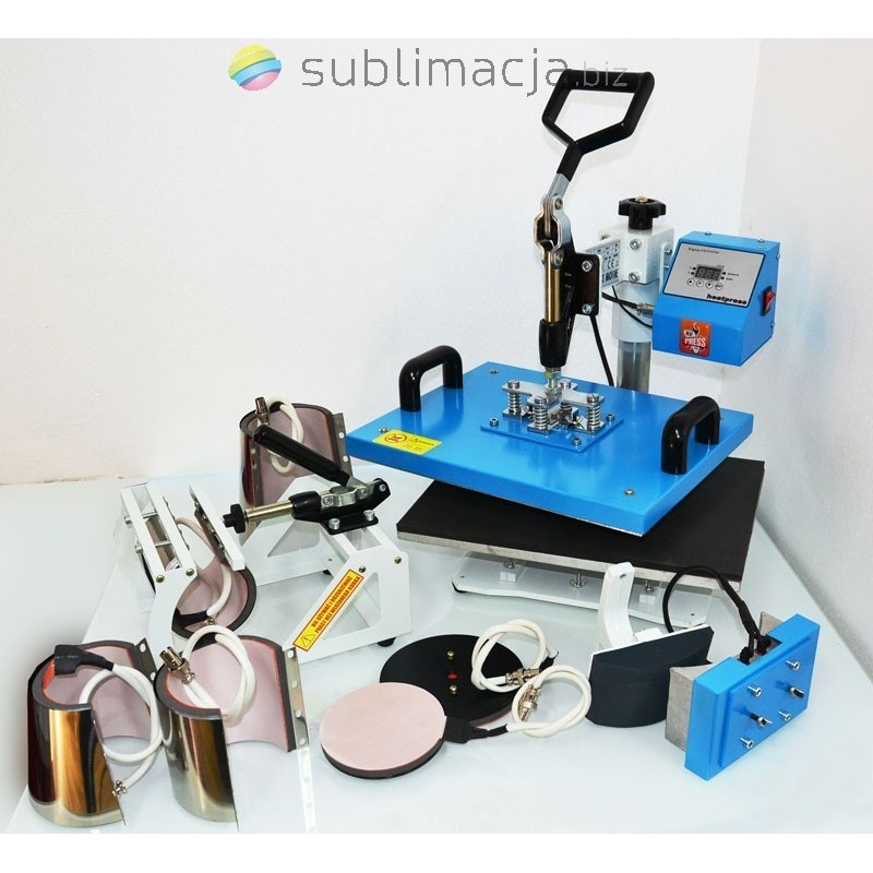 PRASA TERMO-TRANSFEROWA 9 w 1 COMBO maxi. Do koszulek t-shirt, do czapek, do kubków walcowych i stożkowych "latte"- hot mug, dwa zestawy do talerzy dużych i mniejszych. Zestaw zawiera również praskę do butonów - przypinek w skład której praska, zaciskarka, oraz wykrawak. Dodatkowo do tego zestawu dla każdego klienta 100 przypinek GRATIS (Dostępne w rozmiarze 32/58mm). Sublimacja i termotransfer !