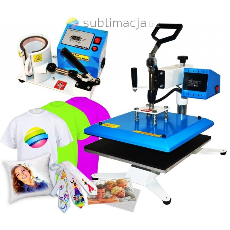 Za pomocą prasy można przenieść swoje wydruki - obrazy na prawie wszystkie materiały (bawełna, jedwab, len, poliester...), a także po wymianie elementu możemy przenosić wydruki na kubki. Płyta grzewcza TEFLONOWA. Regulowany docisk płyty grzewczej.