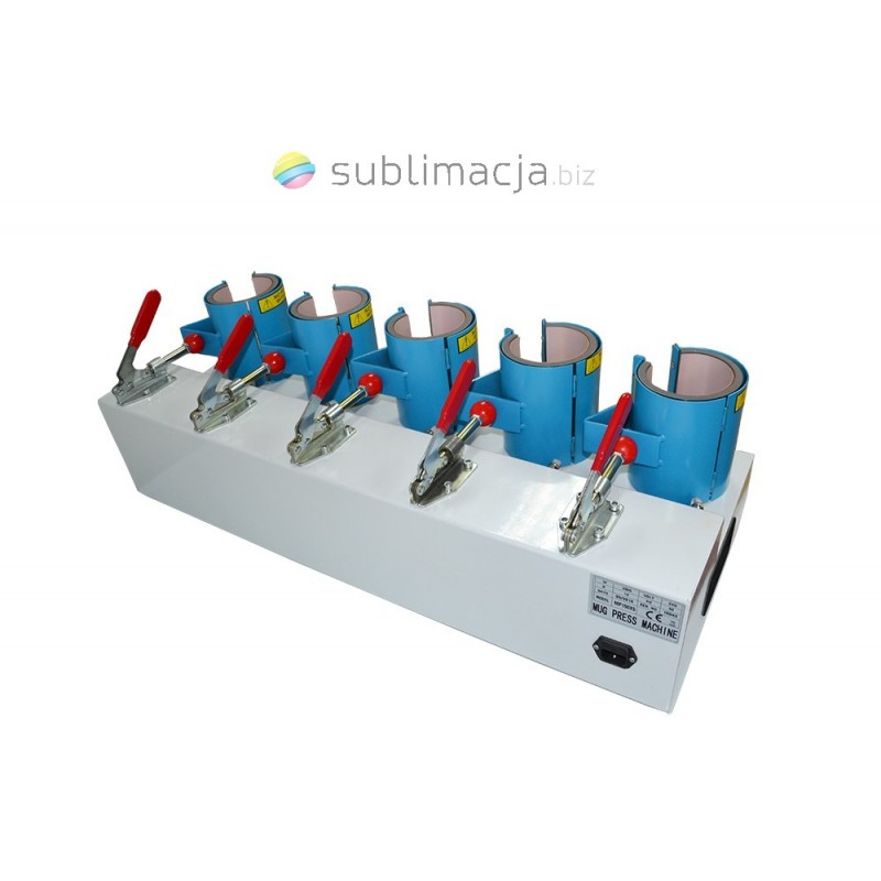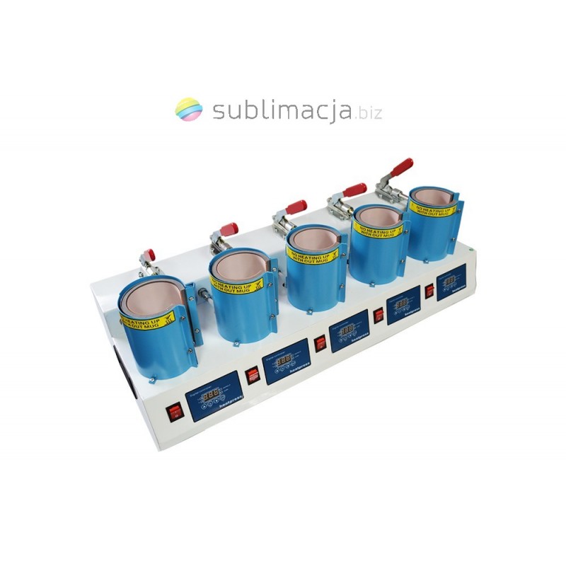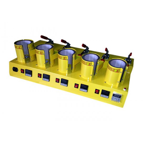 Pięciostanowiskowa prasa transferowa do wykonywania nadruków na kubkach i kuflach. Aby wykonać nadruk na kuflu należy wymienić element grzewczy. Szeroki zakres temperatur powoduje, że na prasie można wykonywać transfery z sublimacji oraz papierów do druku laserowego.