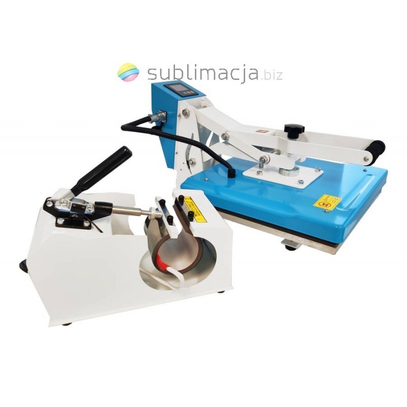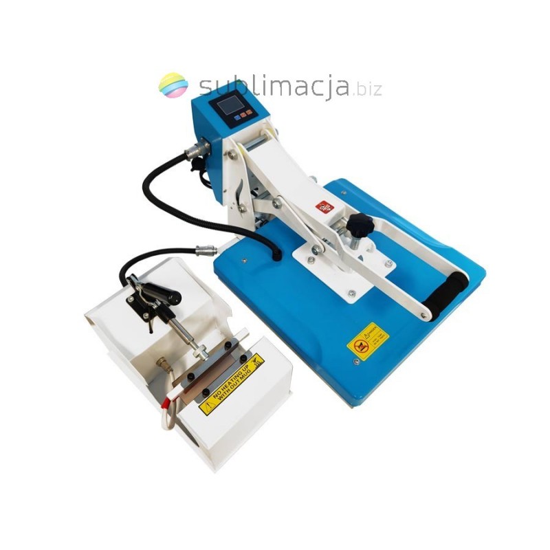 Heat Press Combo 2in1 - prasa transferowa. Główną zaletą tej prasy jest możliwość pracy z materiałami płaskimi, koszulkami, jak i również z kubkami.