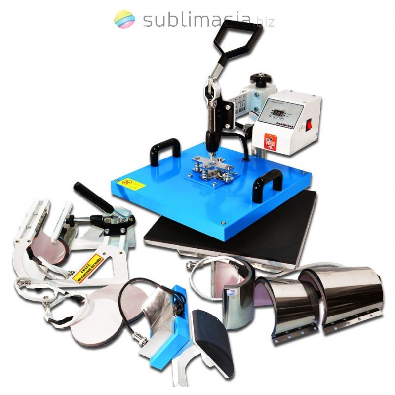 PRASA TERMO-TRANSFEROWA 8 w 1 COMBO. Do koszulek t-shirt, do czapek, do kubków walcowych i stożkowych "latte"- hot mug, dwa zestawy do talerzy dużych i mniejszych. Łatwa wymiana końcówek dzięki zastosowaniu magnetycznych uchwytów, sterowanie elektroniczne, regulowany płynnie docisk. Idealna do sublimacji i termotransferu !